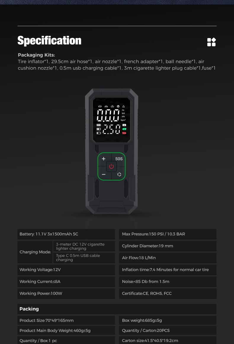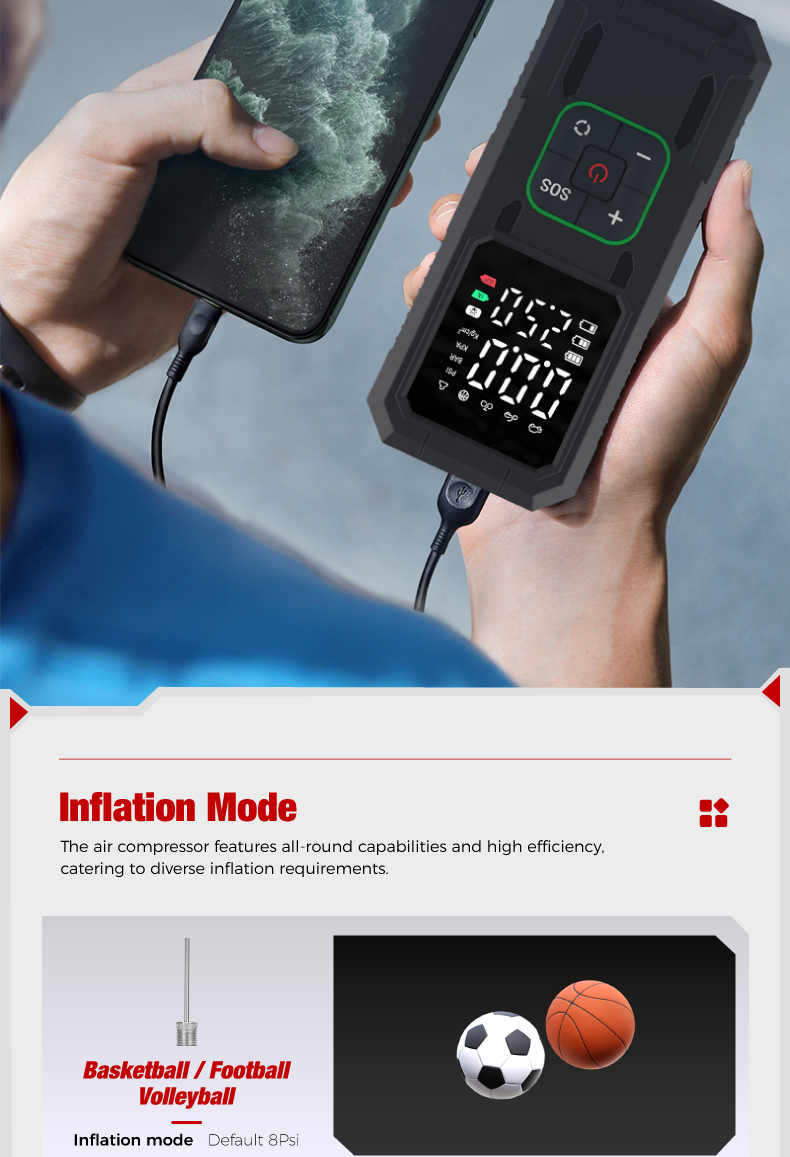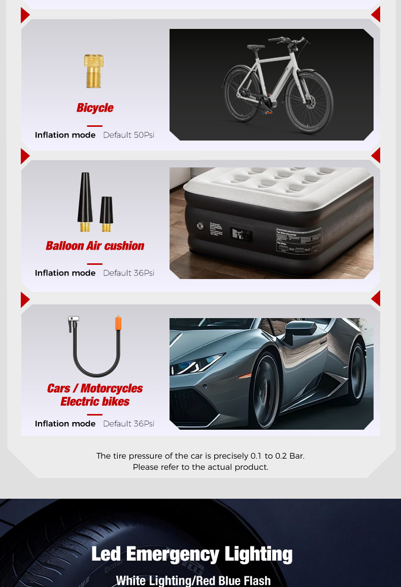Tire inflator'1,29.5cm air hose*1,air nozzle*1,french adapter*1, ball needle*1,air