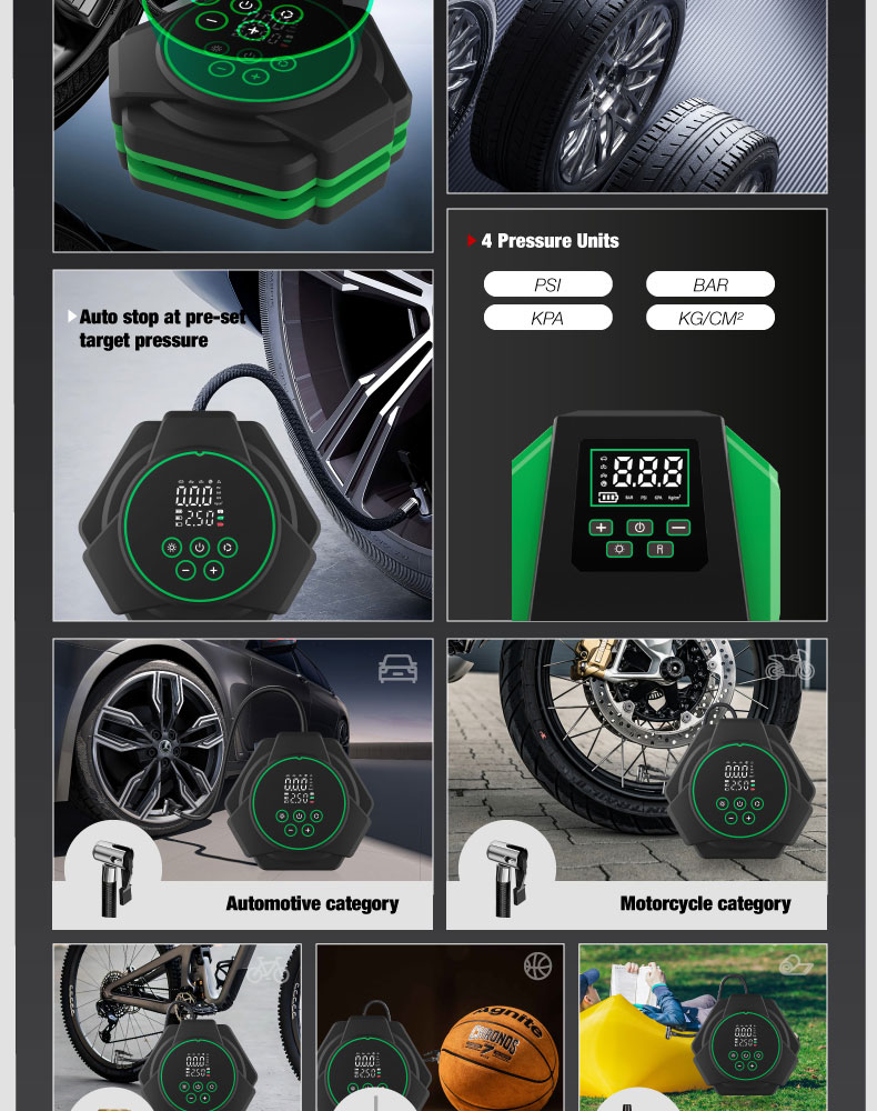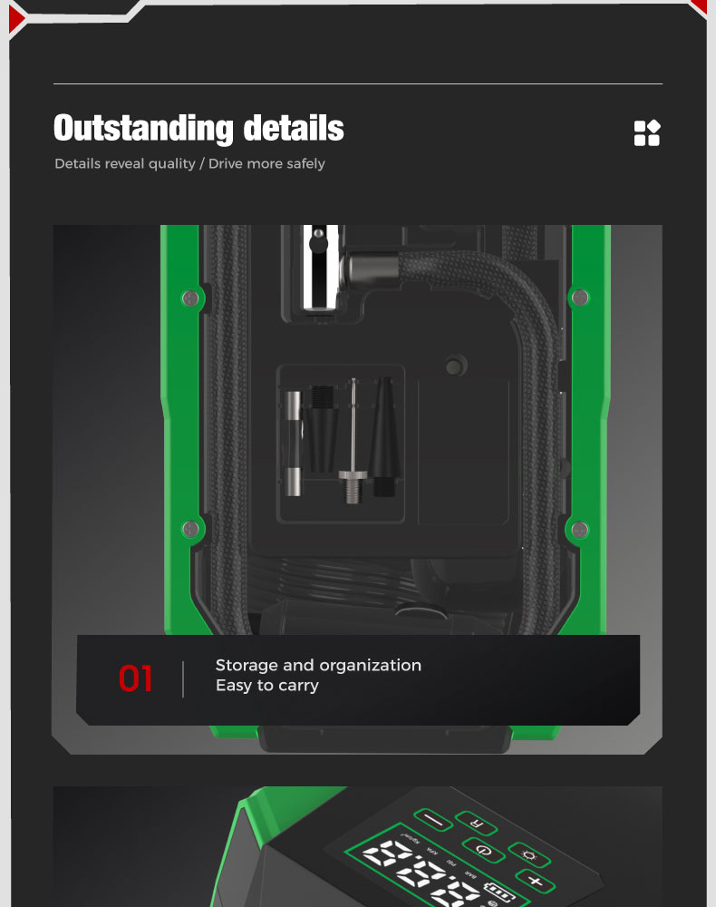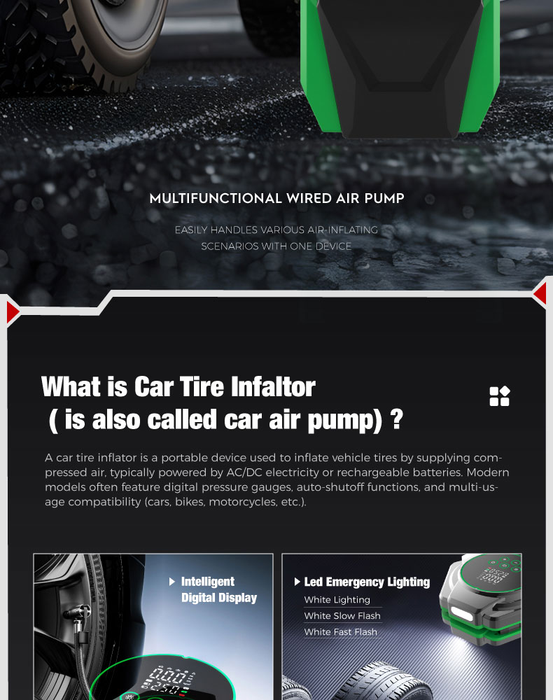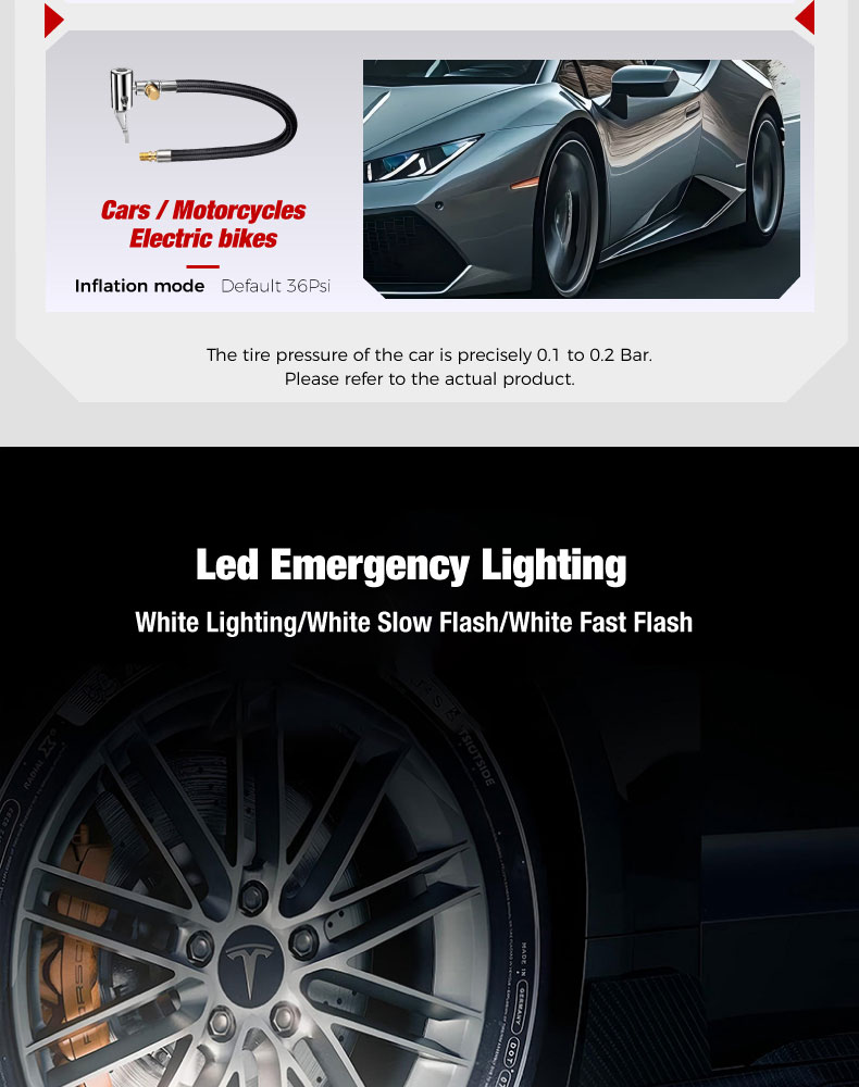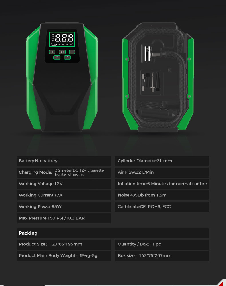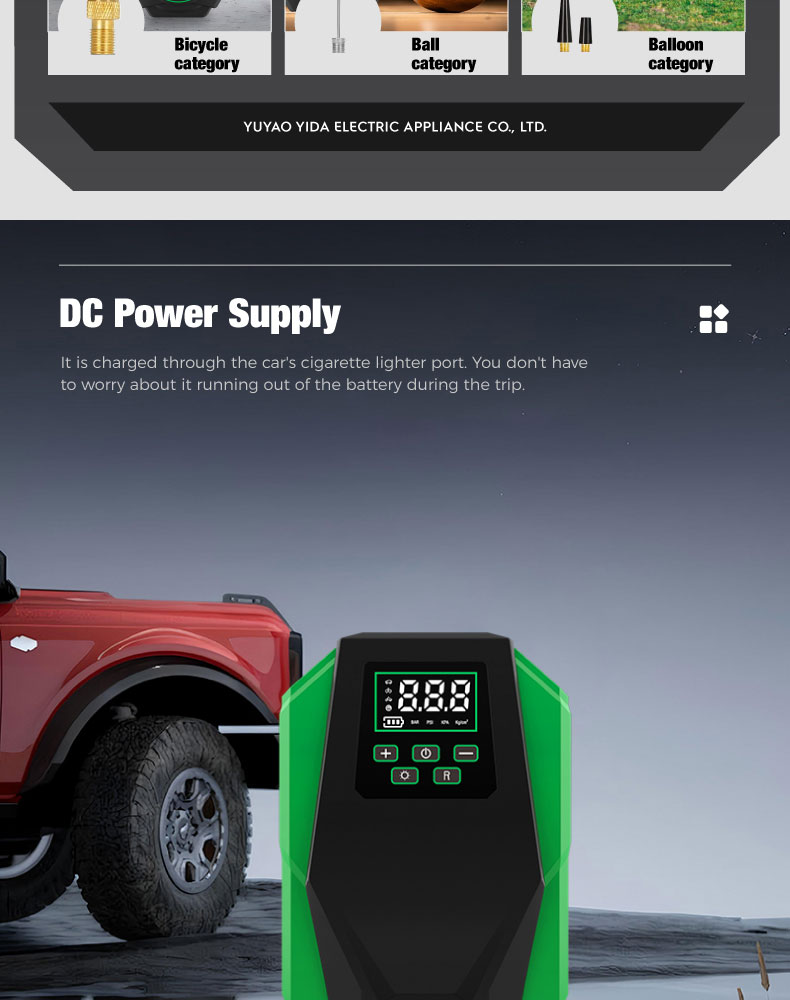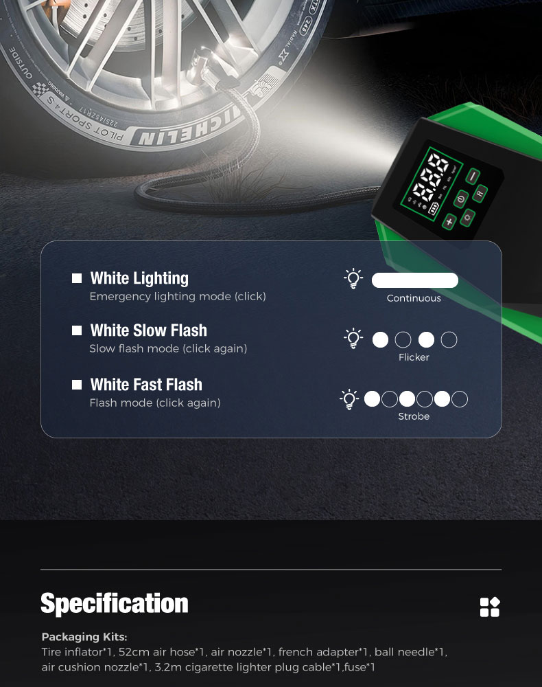 Tire inflator*1, 52cm air hose*1, air nozzle*1, french adapter*1, ball needle*1, air cushion nozzle*1, 3.2m cigarette lighter plug cable*1,fuse*1