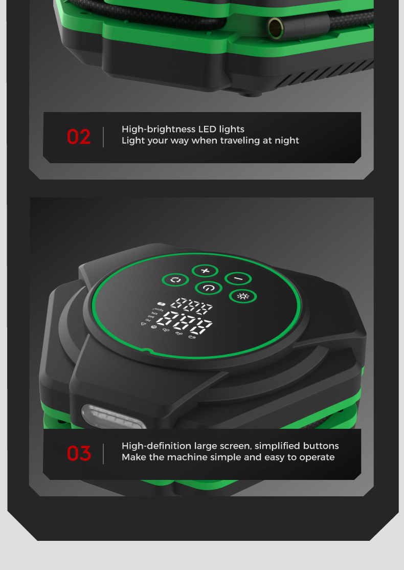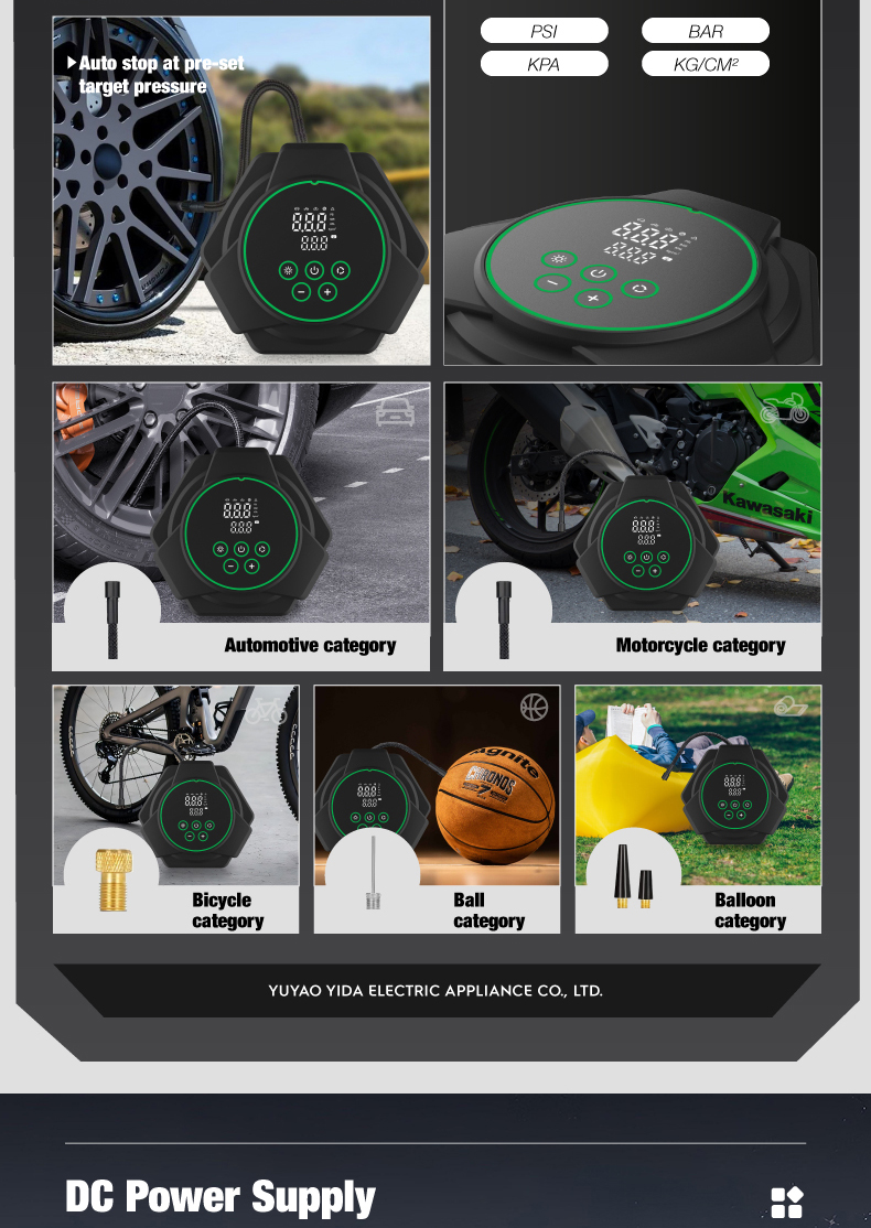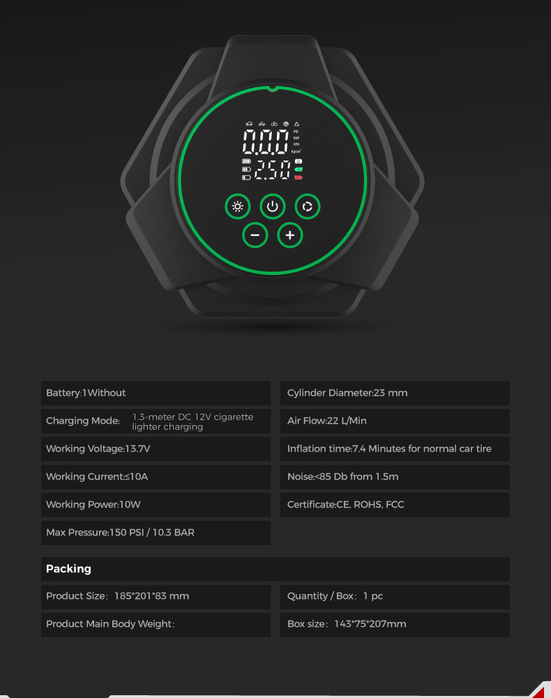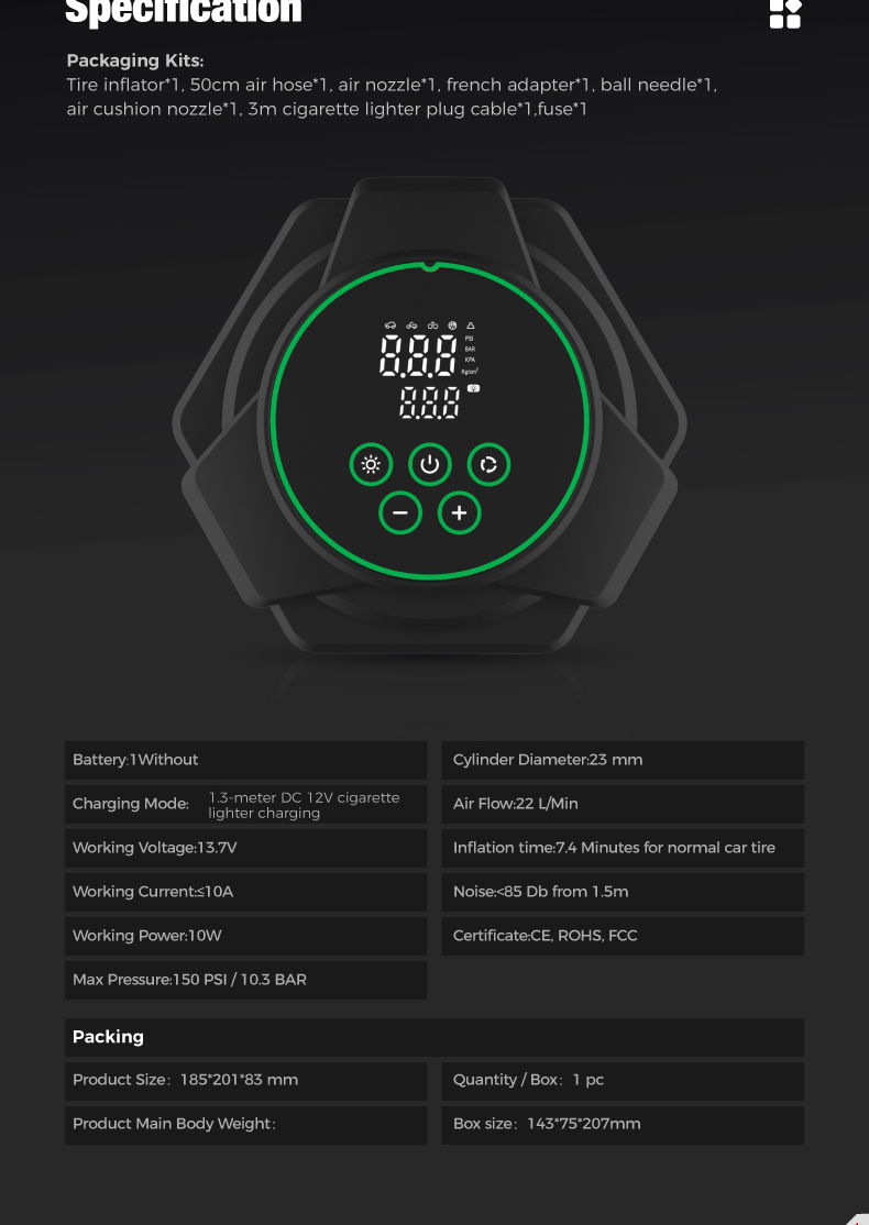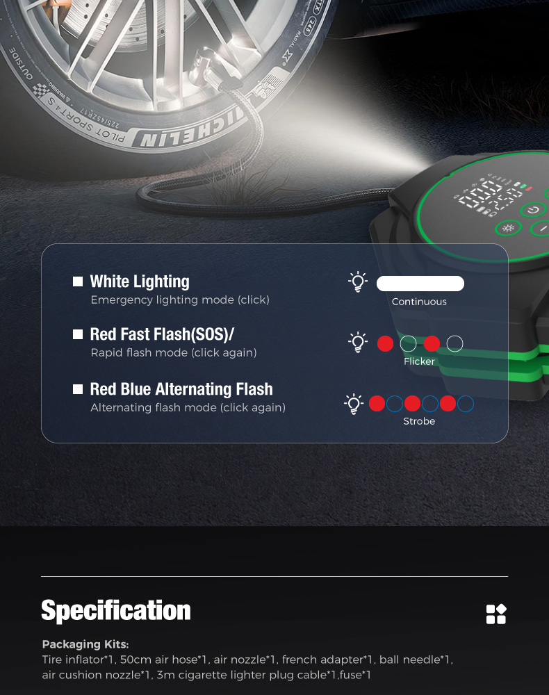 Tire inflator*1, 50cm air hose*1, air nozzle*1, french adapter*1, ball needle*1air cushion nozzle*1,3m cigarette lighter plug cable*1,fuse*1