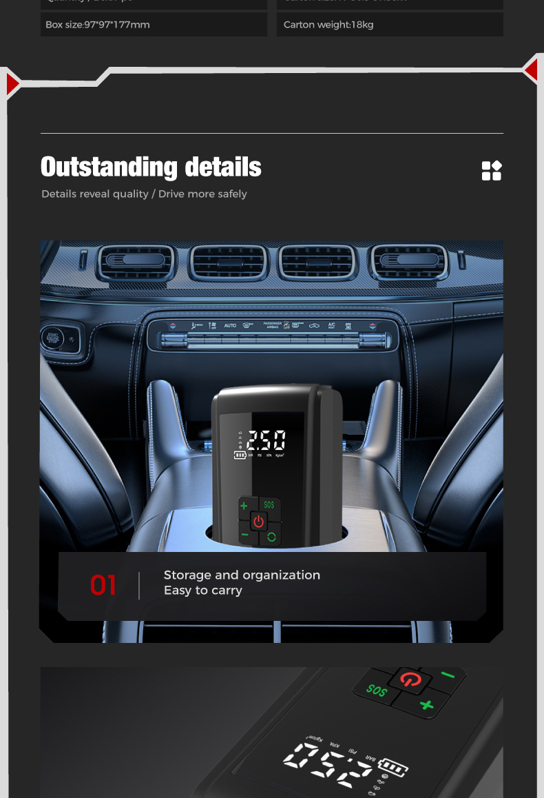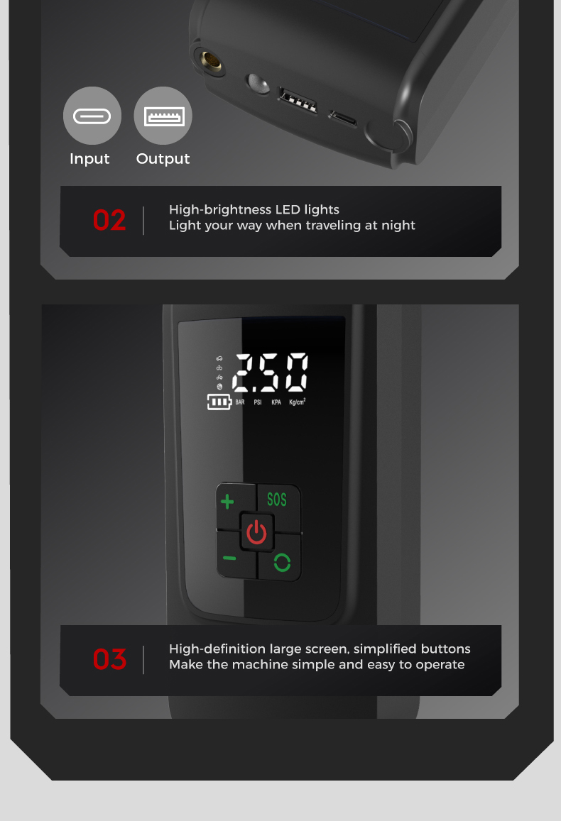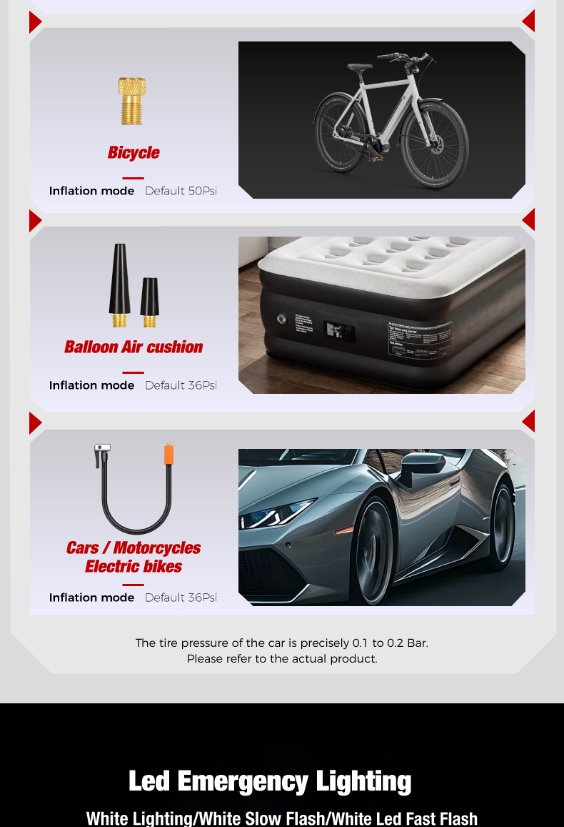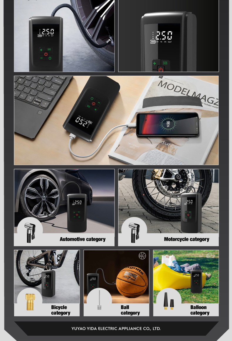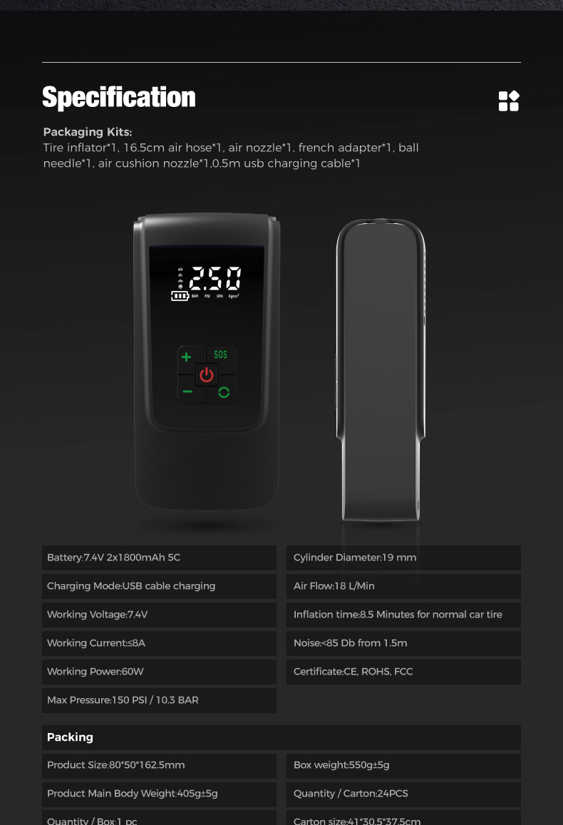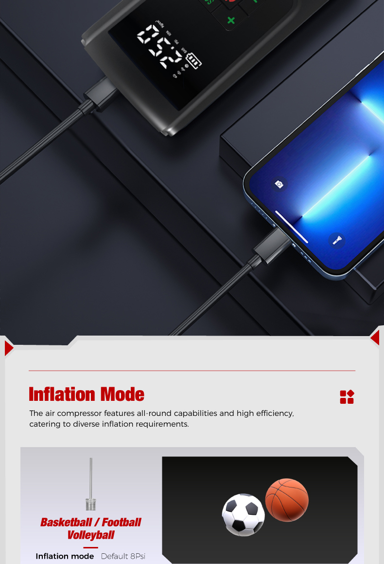 Tire inflator'1,16.5cm air hose*1, air nozzle*1, french adapter*1. ballneedle*1,air cushion nozzle*1,0.5m usb charging cable*1