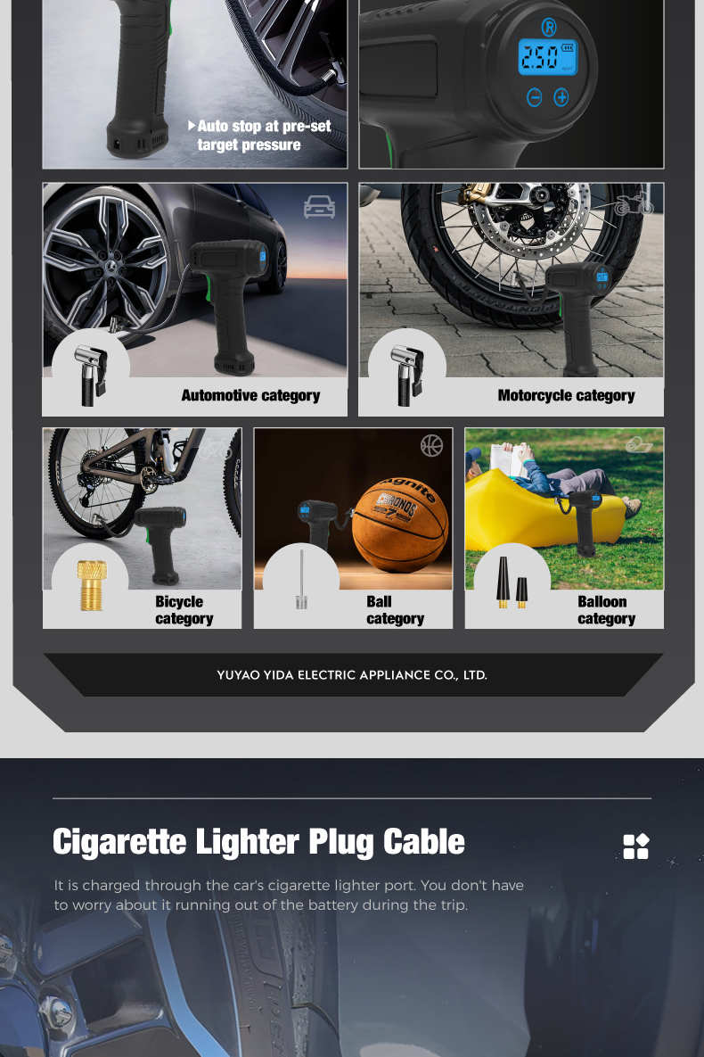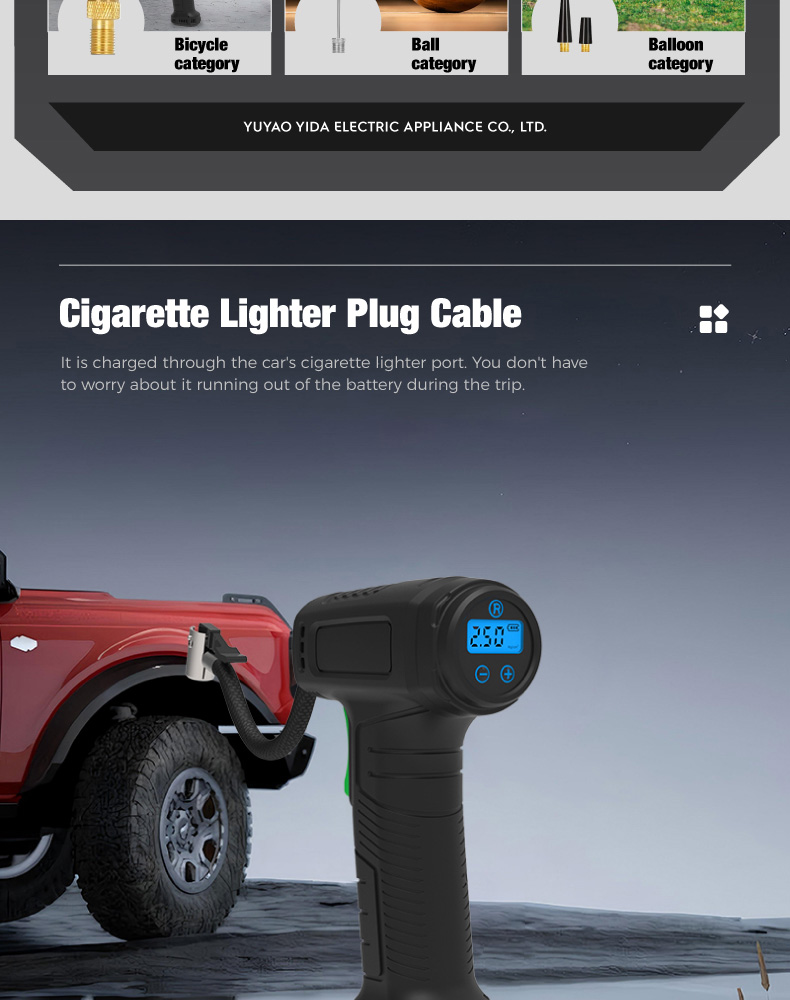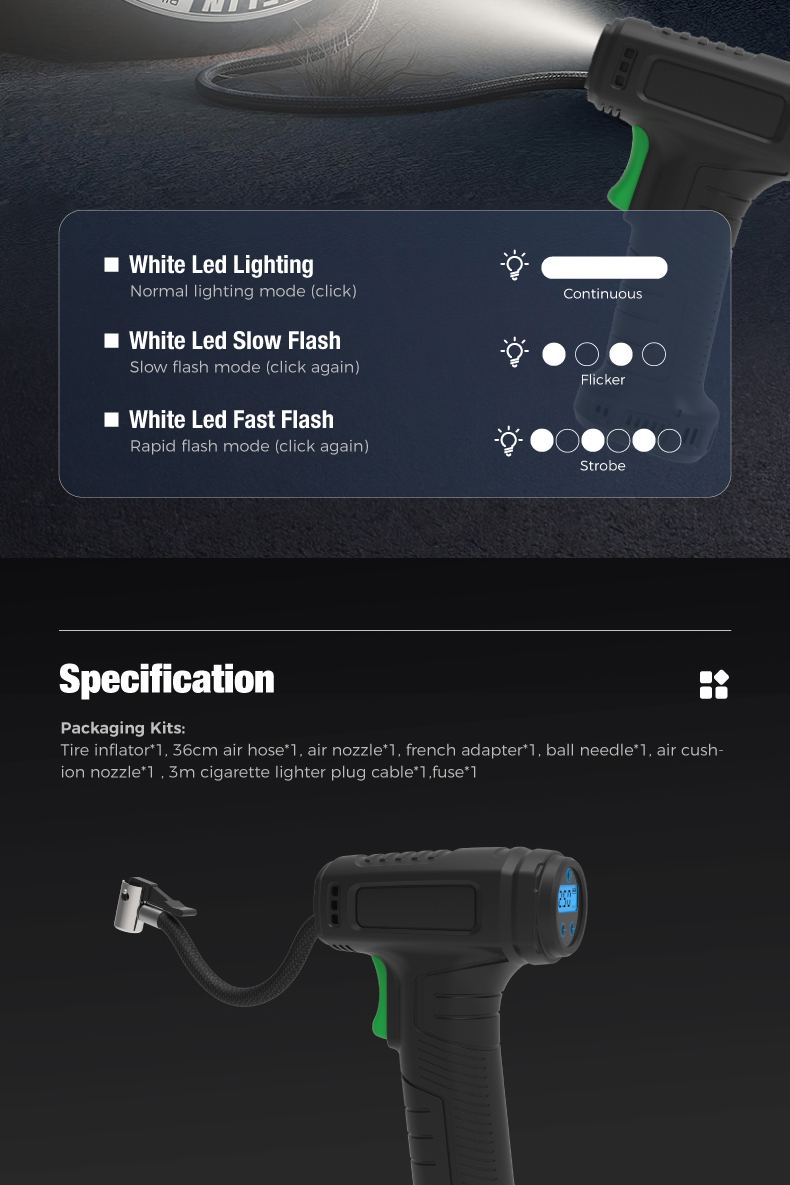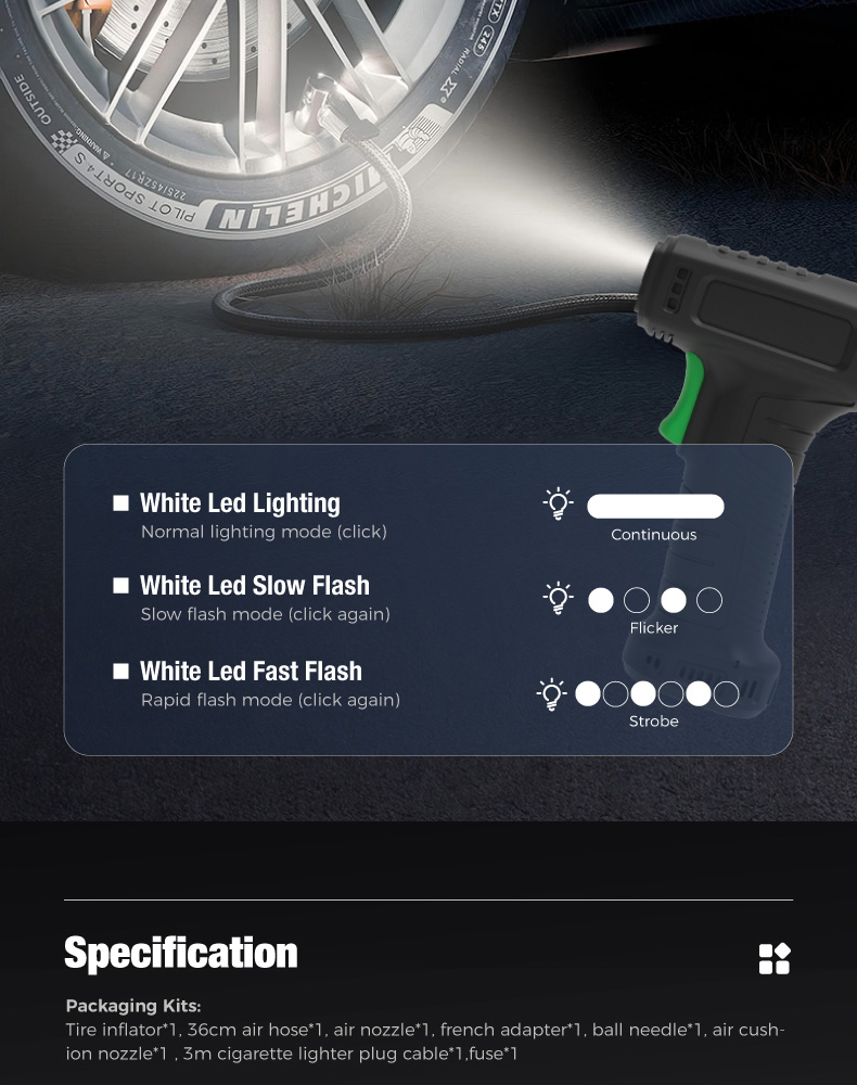 Tire inflator*1, 36cm air hose*1, air nozzle*l, french adapter'1, ball needle*l, air cushion nozzle*1 ,3m cigarette lighter plug cable*1,fuse*1