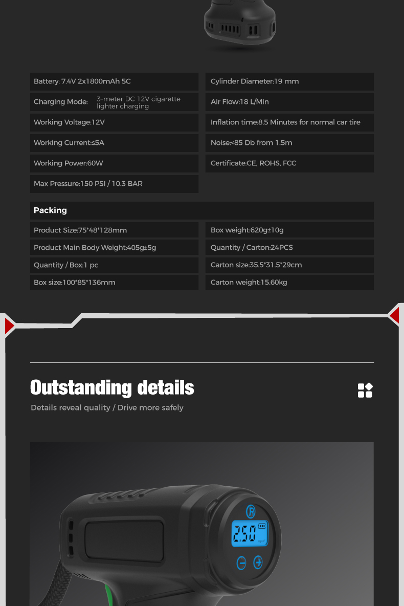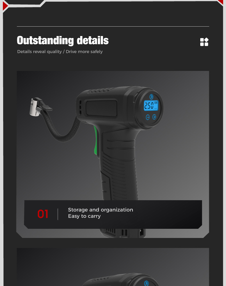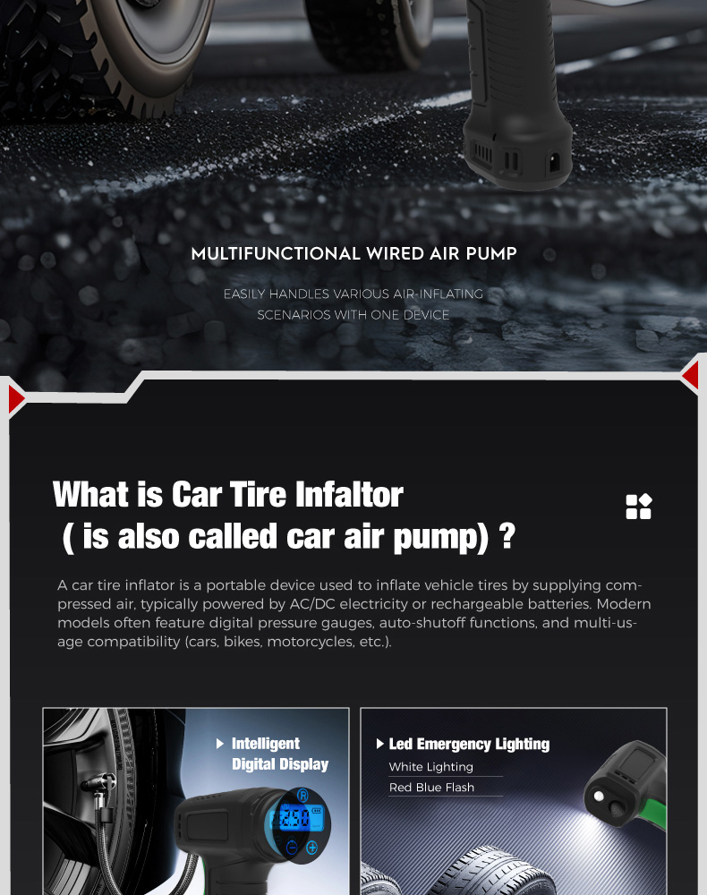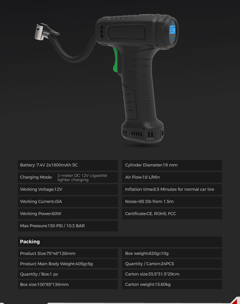 Tire inflator*1, 36cm air hose*1, air nozzle*l, french adapter'1, ball needle*l, air cushion nozzle*1 ,3m cigarette lighter plug cable*1,fuse*1