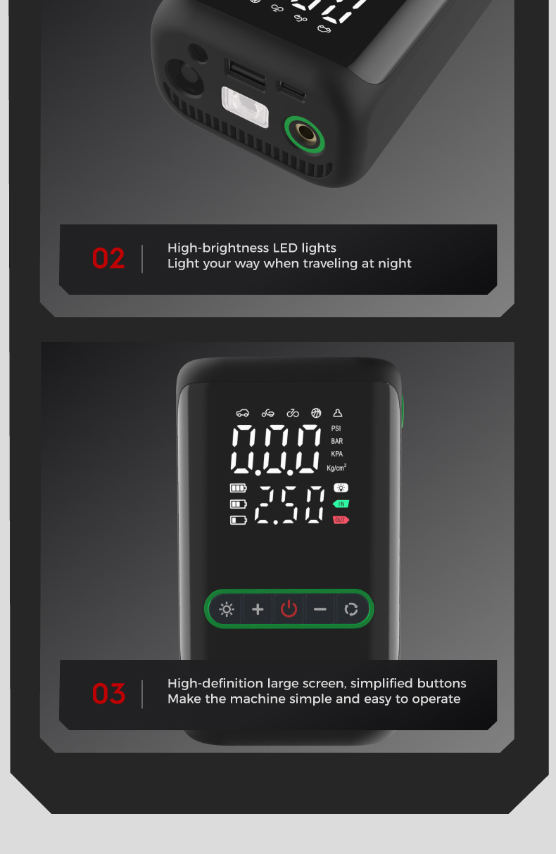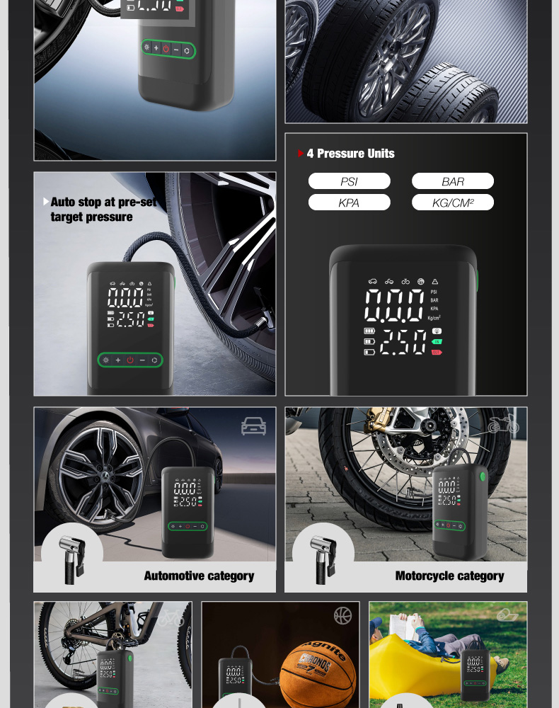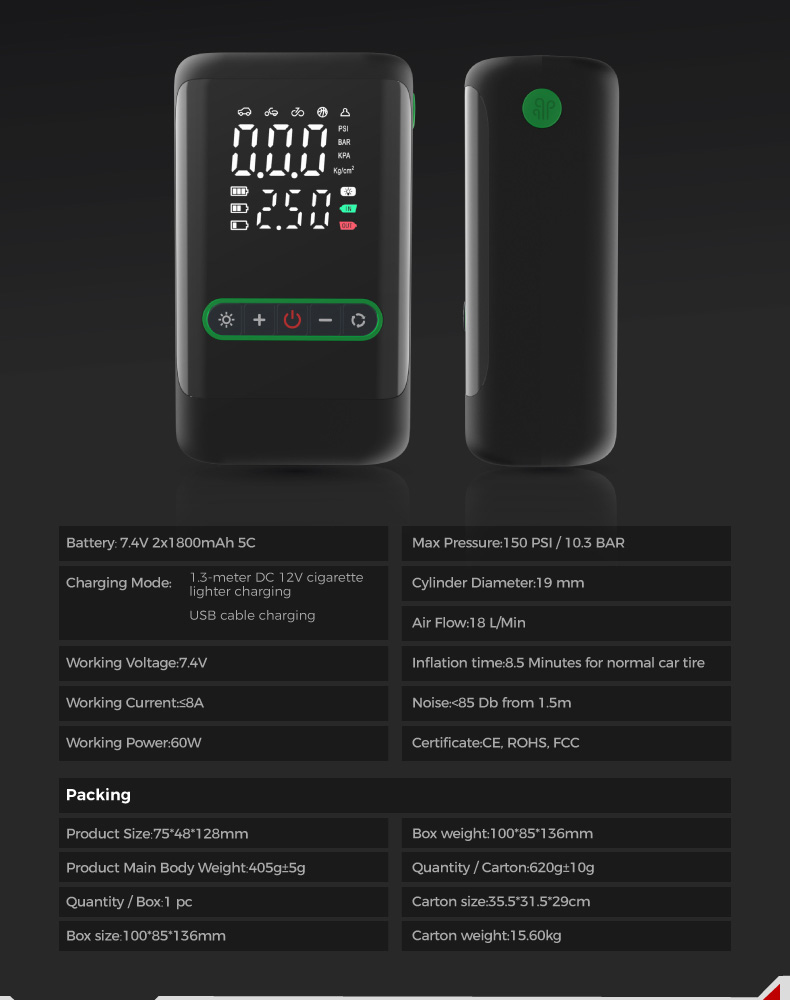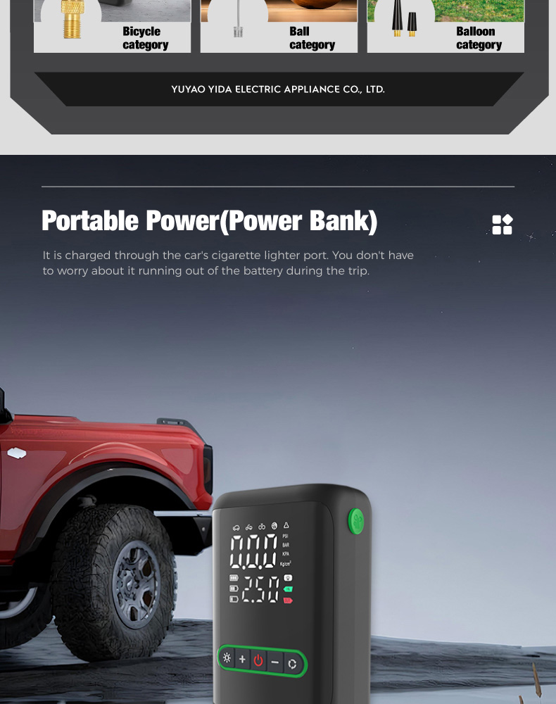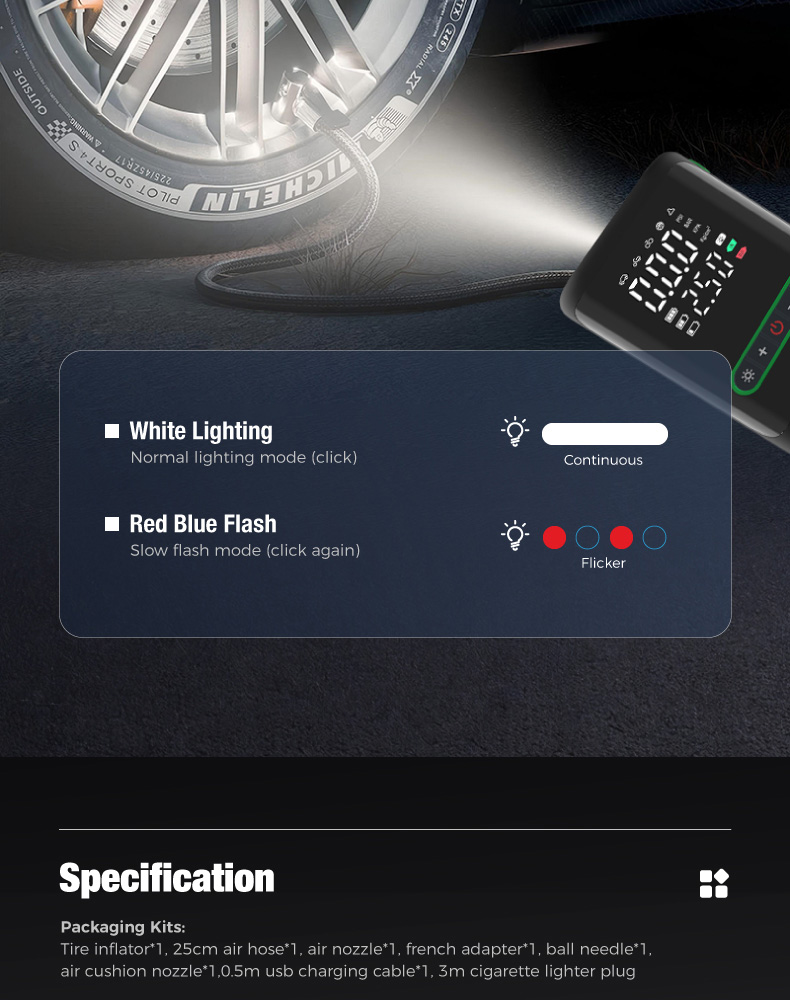 Tire inflator*1, 25cm air hose*1, air nozzle*1, french adapter*1, ball needle*1air cushion nozzle*1,0.5m usb charging cable*, 3m cigarette lighter plug