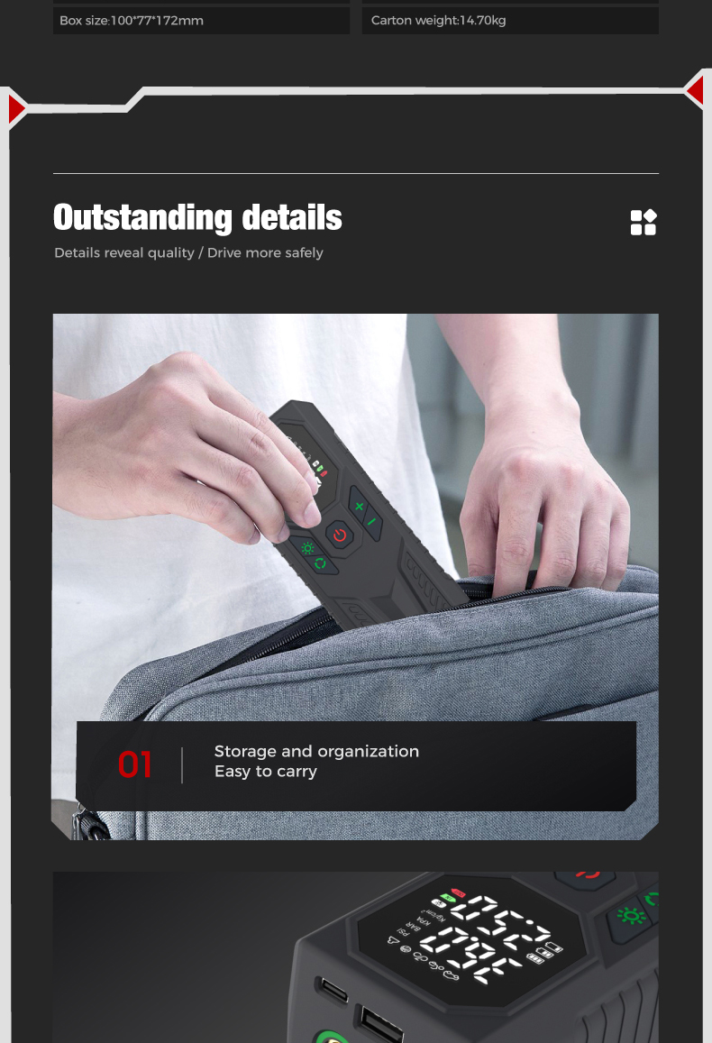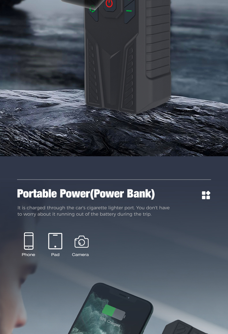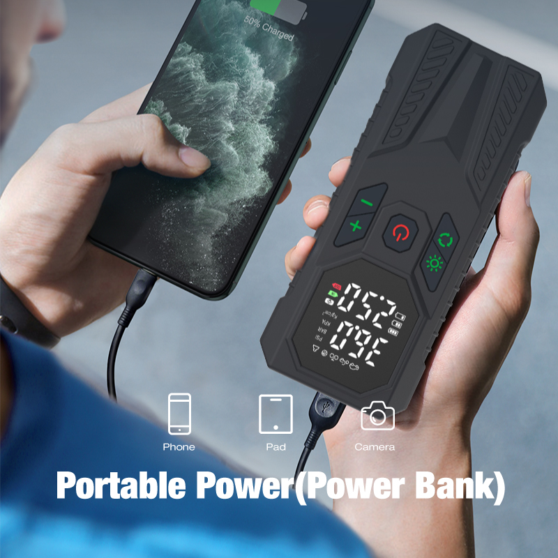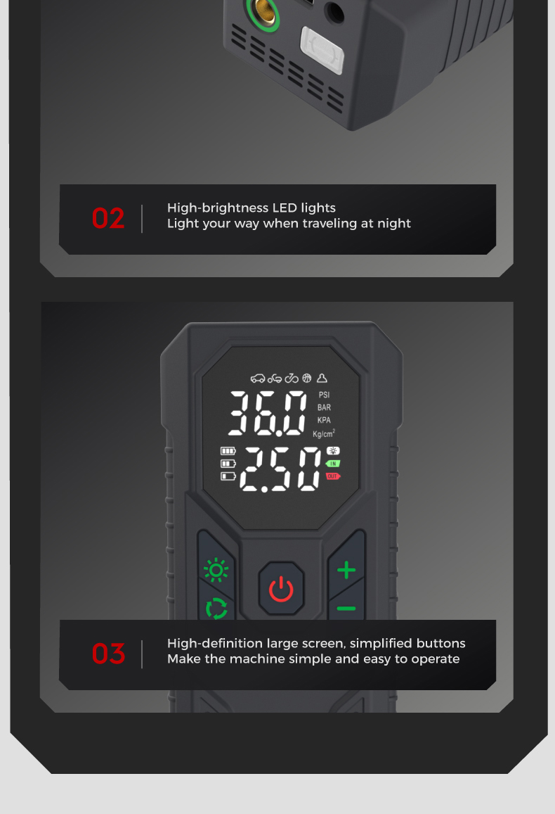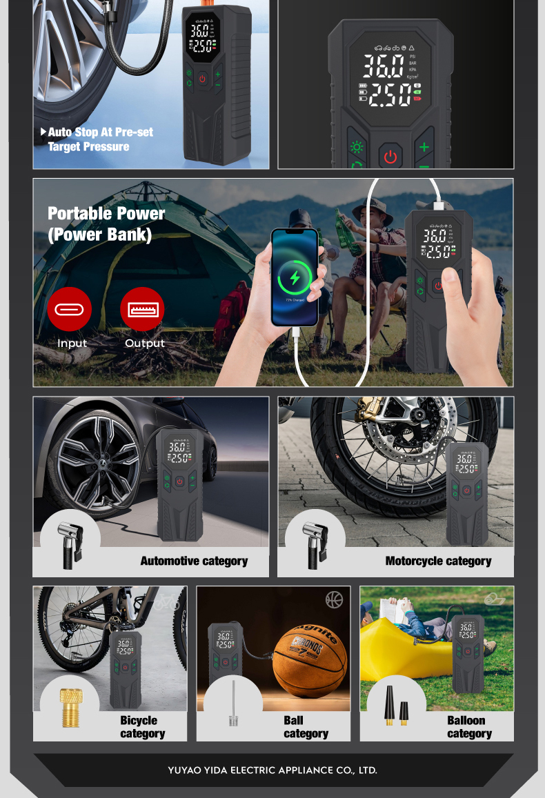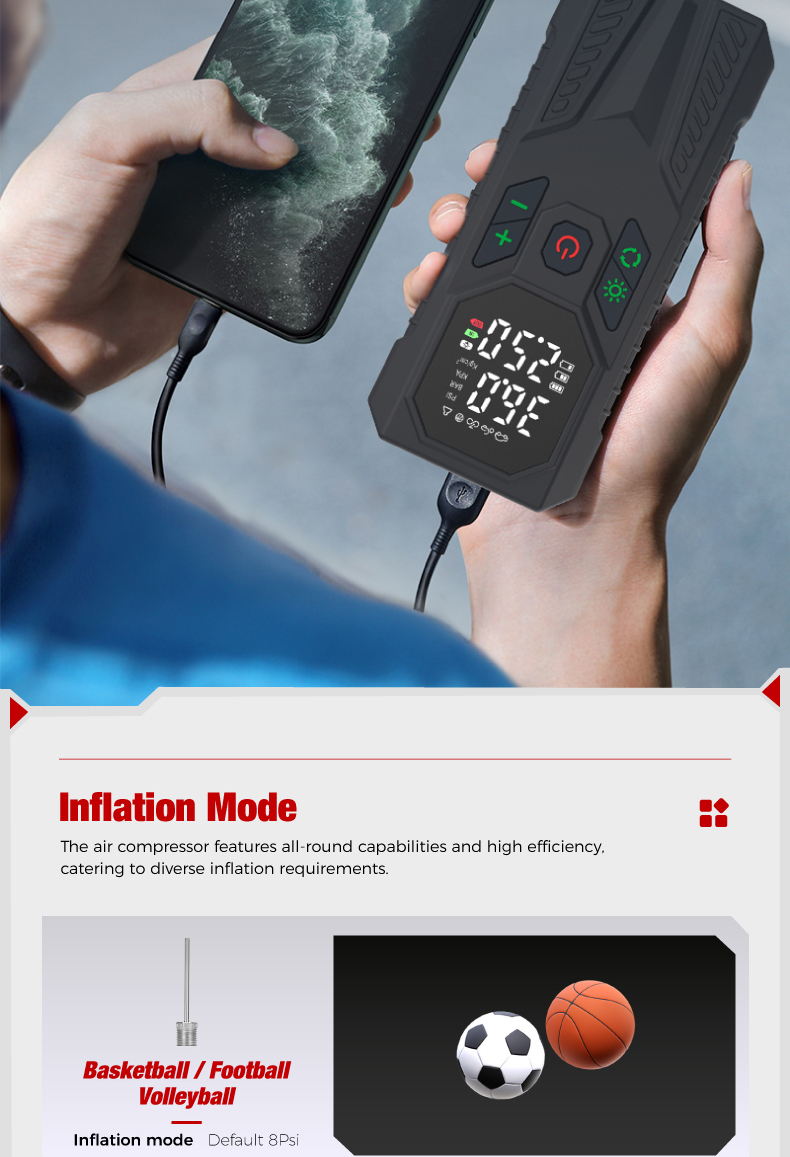 Tire inflator*1, 29.5cm air hose*1, air nozzle*1, french adapter*1, ball needle*l, aircushion nozzle*1, 0.5m usb charging cable*1, 3m cigarette lighter plug cable*1,fuse*1