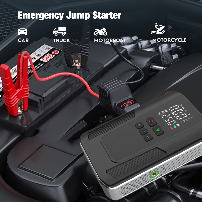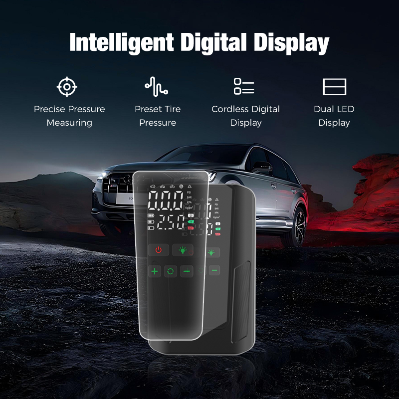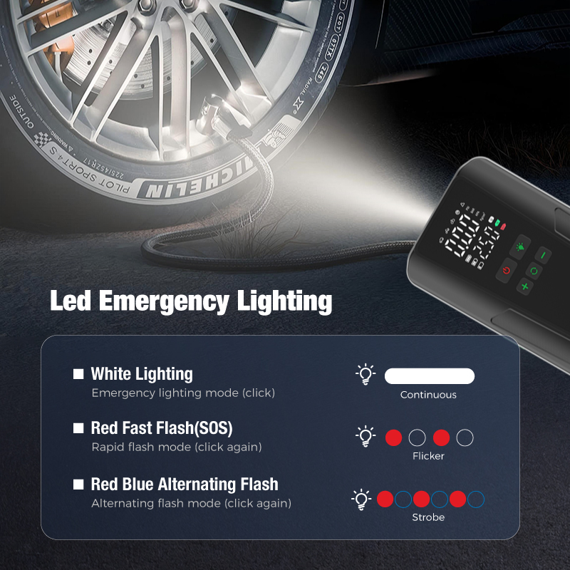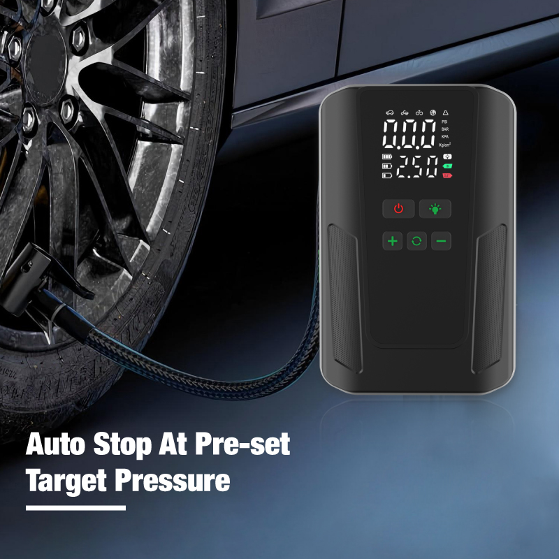 Tire inflator*1, 40cm air hose*1, air nozzle*l, french adapter'1, ball needle*1, air cush-ion nozzle*1,1m usb charging cable*1, ignition clip + EC5 male connector