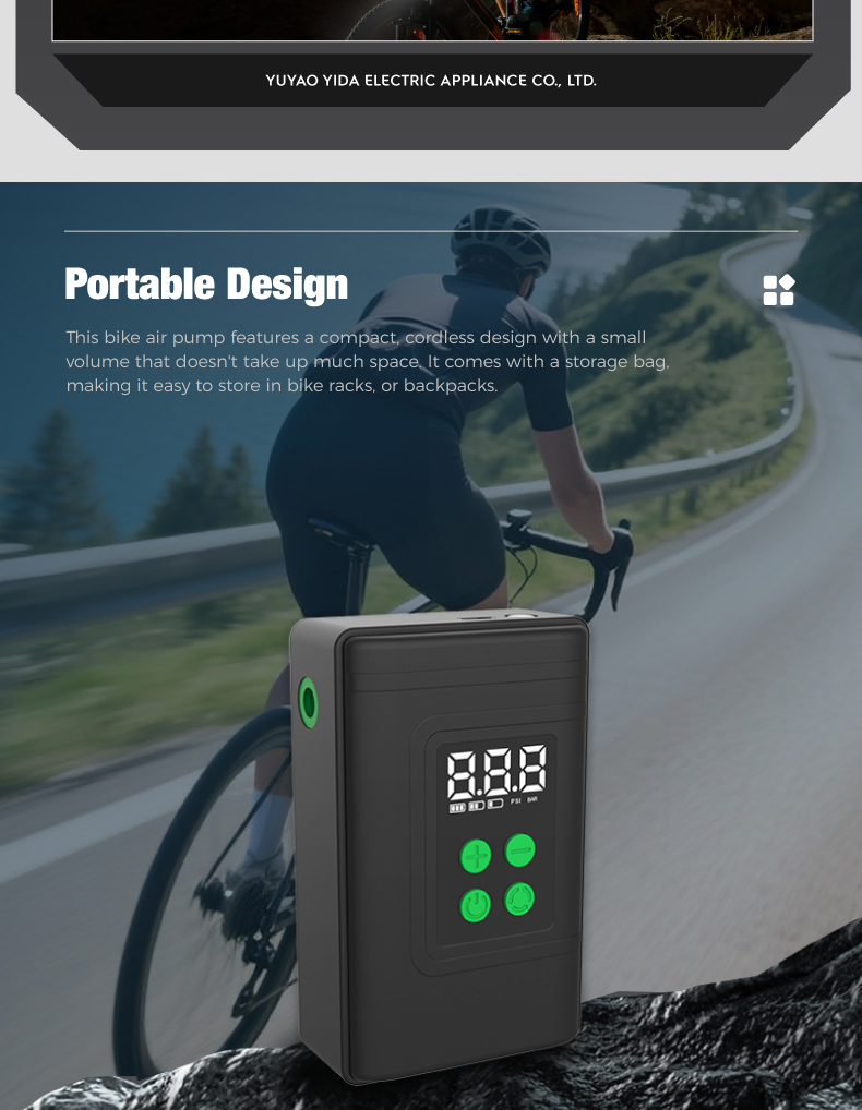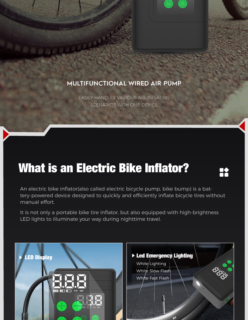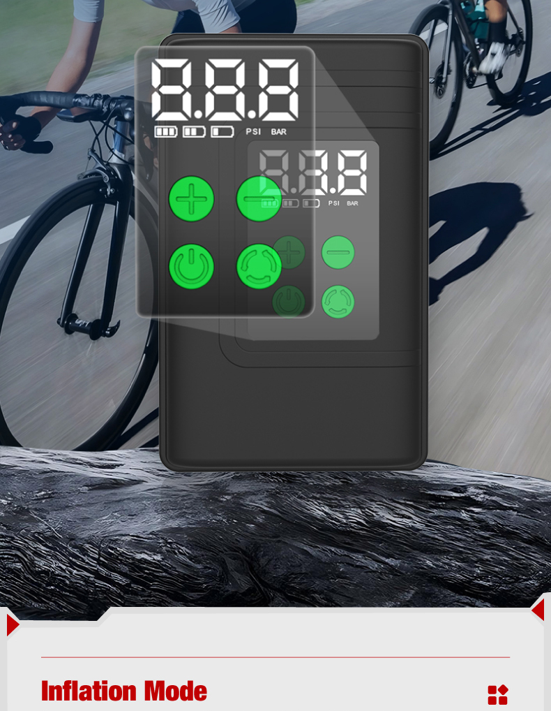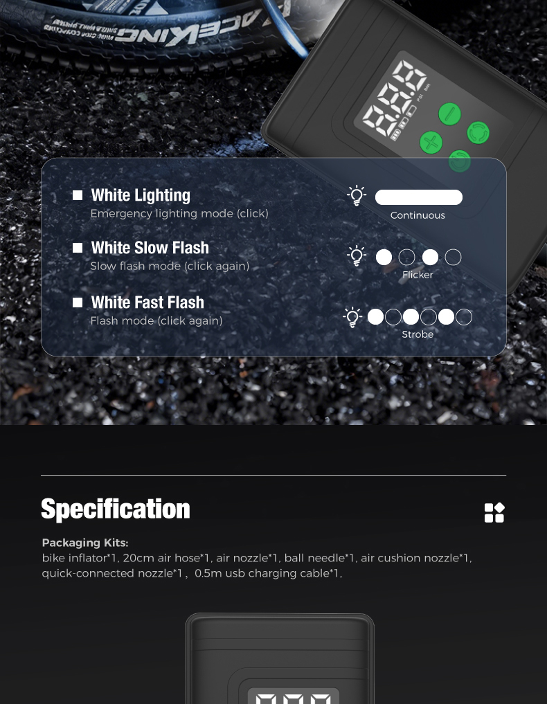 bike inflator*1, 20cm air hose*1, air nozzle*1, ball needle*1, air cushion nozzle*1 quick-connected nozzle*1, 0.5m usb charging cable*1.
