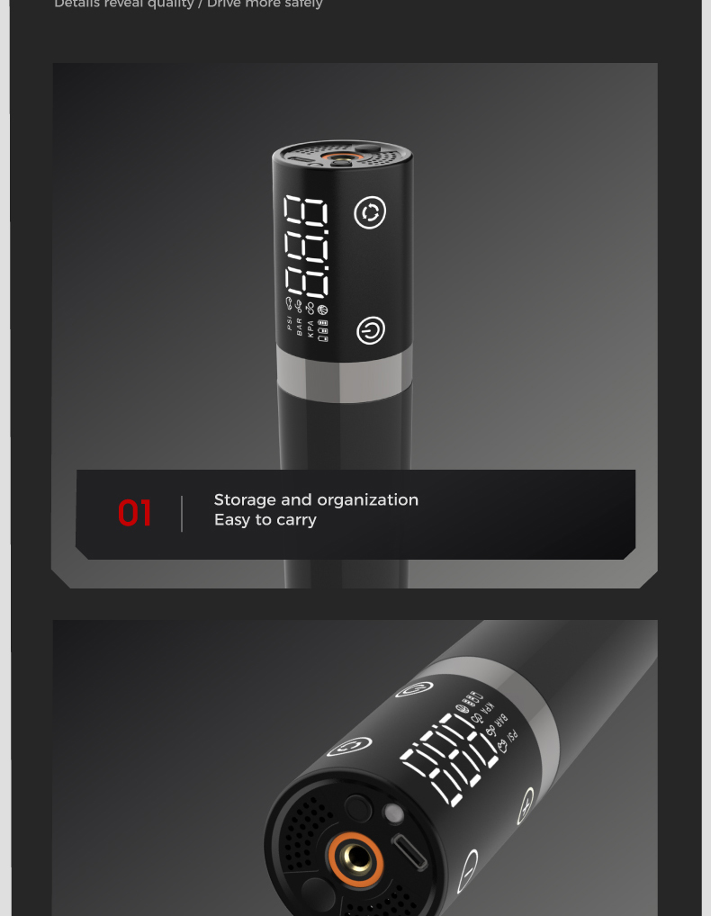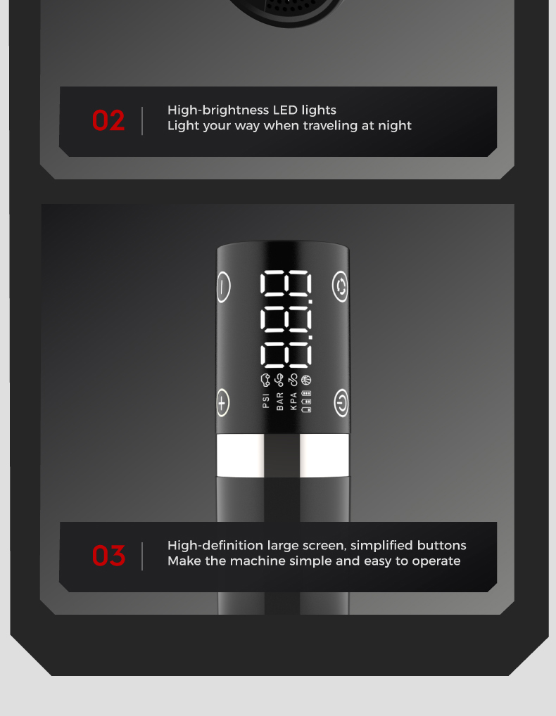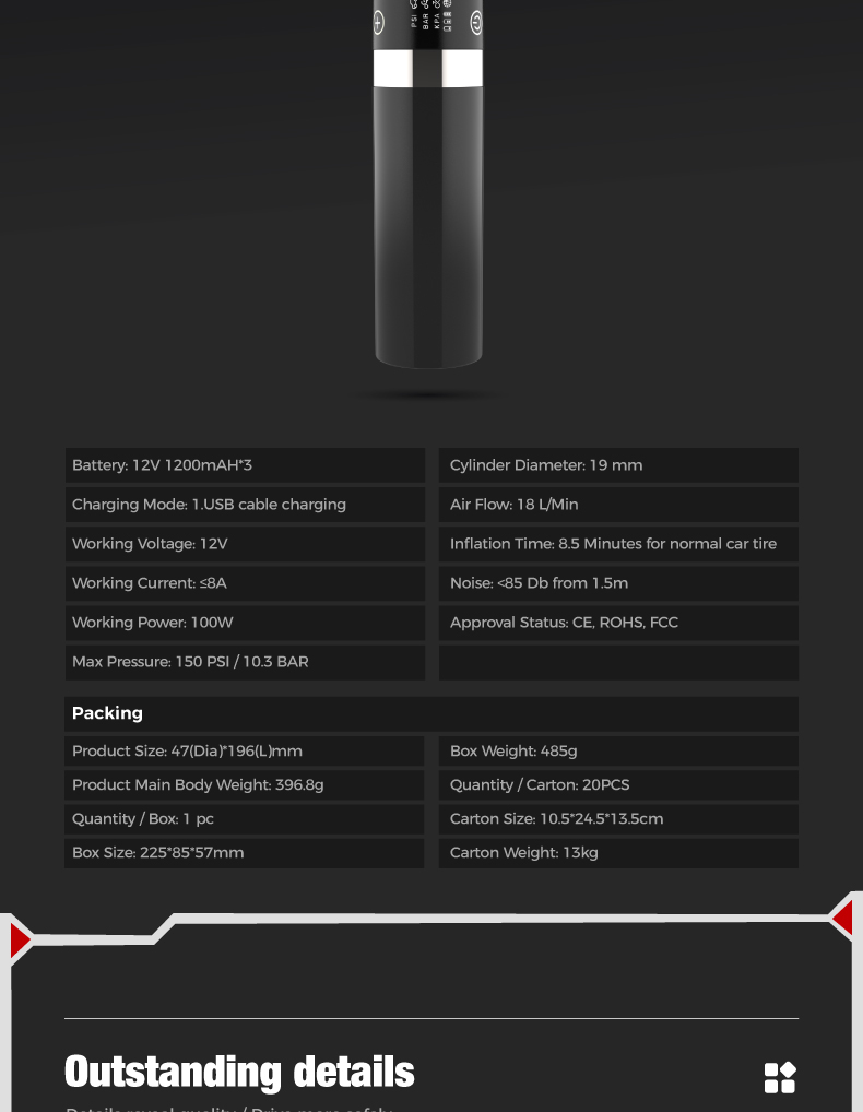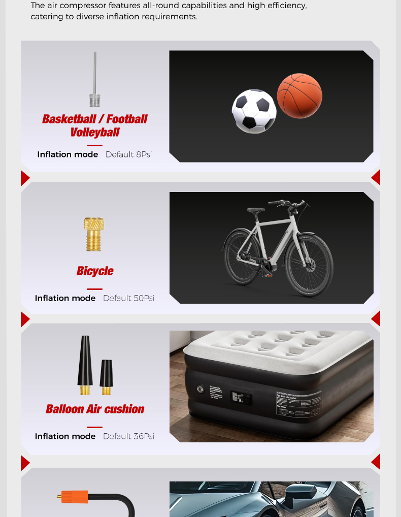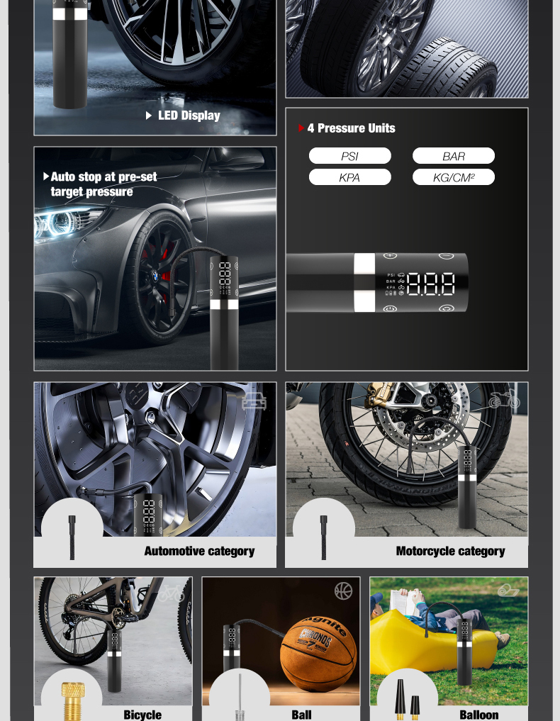 Tire inflator'1, 20cm air hose*1, air nozzle*1, french adapter'1, ball needle*1, air cush. ion nozzle*1,0.5m usb charging cable*1