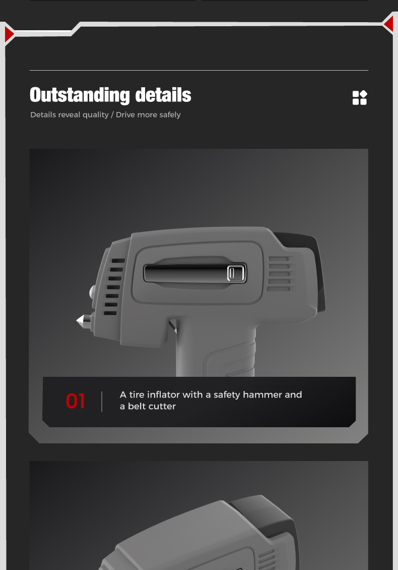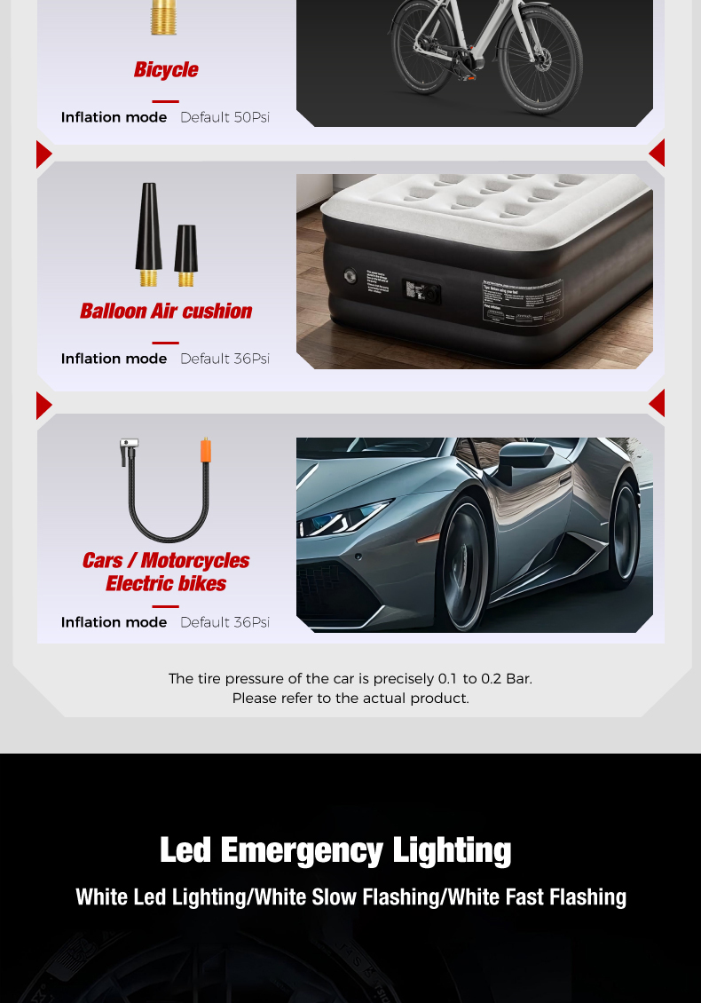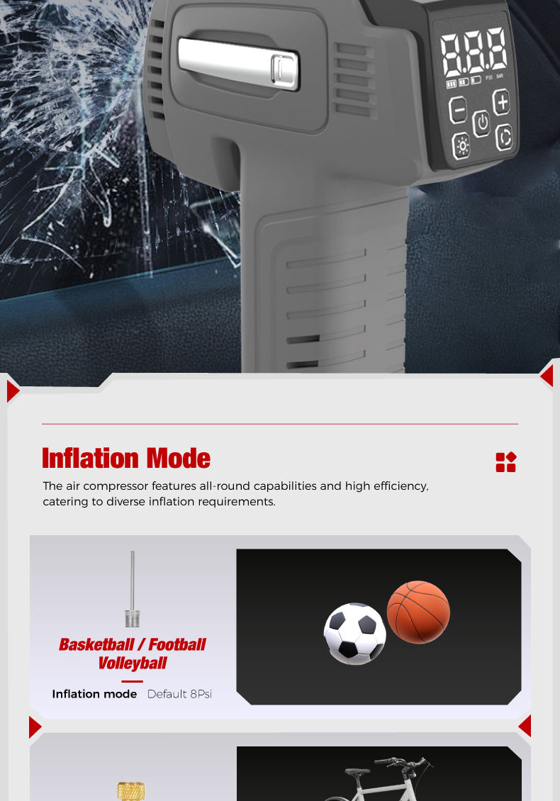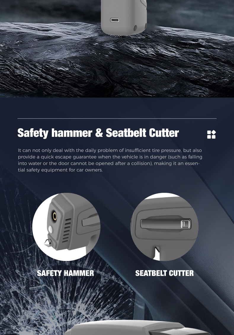 Tire inflator*1, 25cm air hose*1, air nozzle*1, french adapter*1, ball needle*1, air cush-ion nozzle*1,0.5m usb charging cable*1, 3m cigarette lighter plug cable*1,fuse*1
