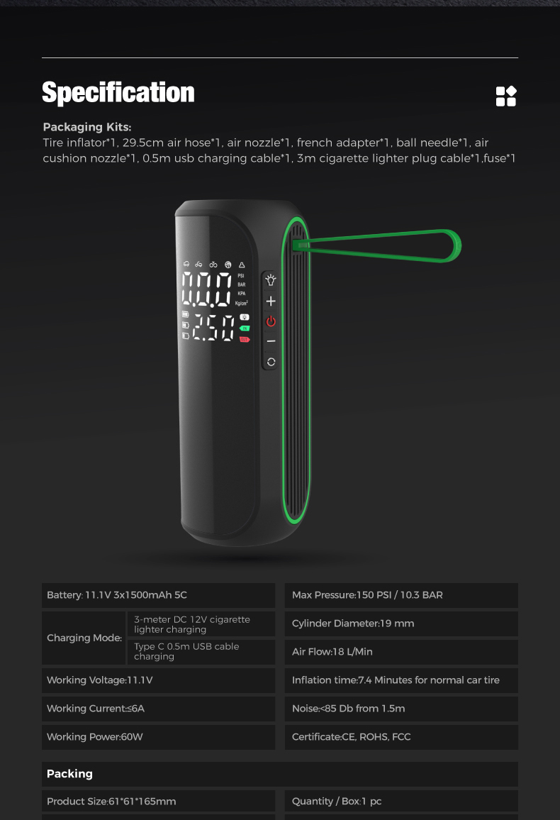Tire inflator*1, 29.5cm air hose*1, air nozzle*1, french adapter*1. ball needle*1, aircushion nozzle*1, 0.5m usb charging cable*1, 3m cigarette lighter plug cable*1.fuse*1